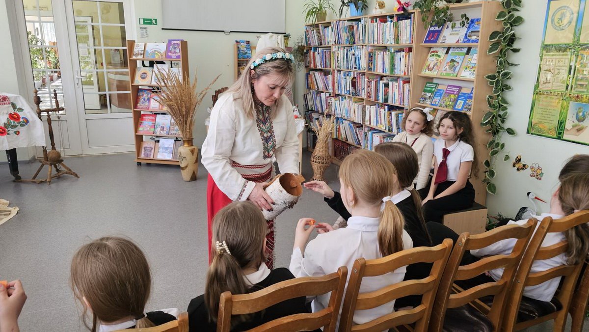 У імправізаванай сялянскай хаце дзяцей хлебам і соллю сустрэлі гасцінныя гаспадыні. Яны прапанавалі школьнікам перанесціся ў мінулае і даведацца, як праводзілі будныя дні і як сустракалі святы нашы продкі. Хлопчыкі і дзяўчынкі таксама ўспомнілі, якія прадметы народнага побыту яны бачылі ў сваіх бабуль і дзядоў, расказалі, што захавалася ў іх дома.