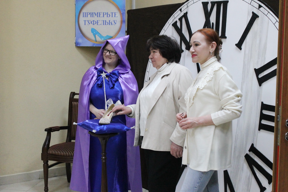 В фойе второго этажа гостей ждала Золушка с предложением примерить туфельку и сфотографироваться в карете. Рядом с тыквой Фея-крёстная предлагала поучаствовать в играх и помочь Золушке попасть на бал. Этому всячески препятствовала злая мачеха, которая требовала определить вид ткани и рассортировать крупы.