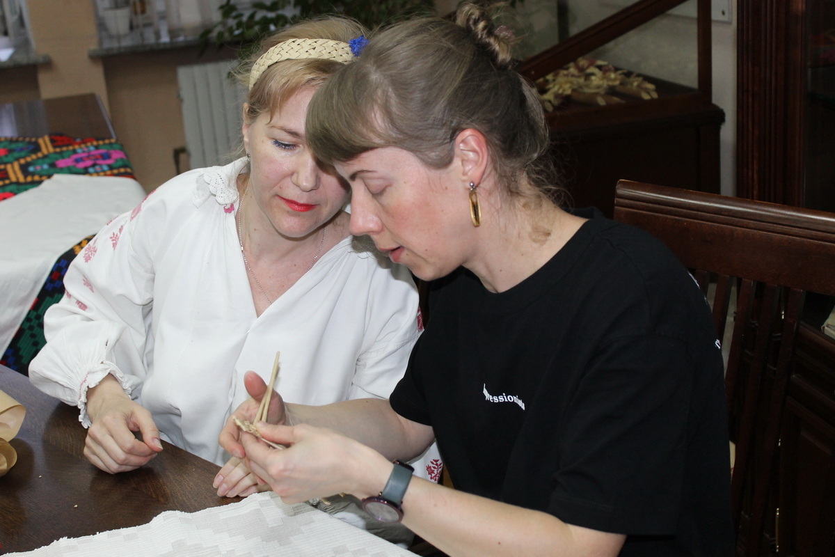 На этой же площадке сотрудник центральной городской библиотеки им. А.И. Герцена учила гостей плетению лаптей из газетных трубочек.