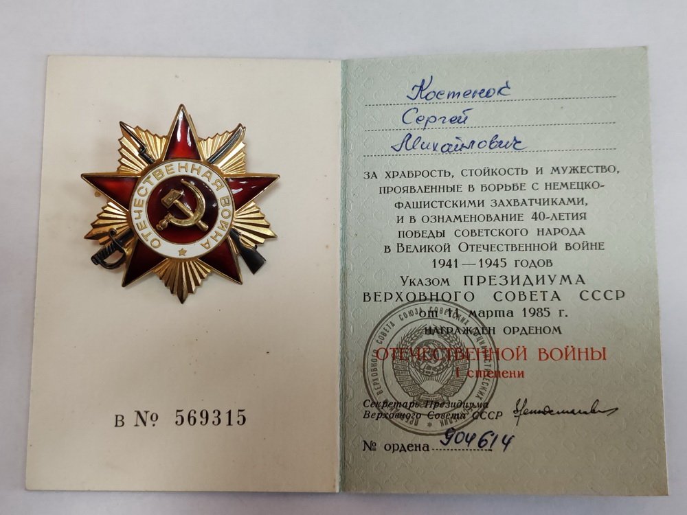 «Мой дедушка, Костенок Сергей Михайлович, родился в 1918 году. До Великой Отечественной работал в колхозе. В 1939 году был призван рядовым и участвовал в Советско-финской войне. Был ранен. Вначале Второй мировой войны, в июле 1941 года был призван рядовым в 100 танковую бригаду Калининского фронта, где воевал в разведке до 1943 года. После серьёзного ранения (инвалид 2 группы) вернулся домой и продолжил работать в колхозе.