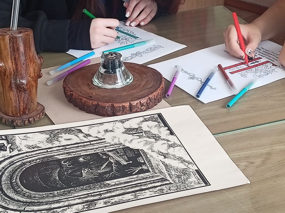 Участники урока раскрасили Буквицу из книги «Ветковская Буквица» и послушали историю о принципах создания буквиц, написанную Галиной Нечаевой в книге.