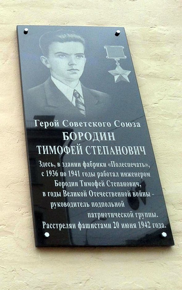 «особые заслуги, мужество и героизм, проявленные в борьбе против немецко-фашистских захватчиков» Бородину Тимофею Степановичу посмертно присвоено звание Героя Советского Союза. Похоронен в Комсомольском сквере. В Гомеле в 2009 году в микрорайоне «Мельников луг» появилась улица Тимофея Бородина, а в 2020 году стену одной из новостроек украсил мурал с изображением Тимофея Степановича. На здании фабрики «Полеспечать» и на домах, где находились конспиративные квартиры, расположены мемориальные доски»