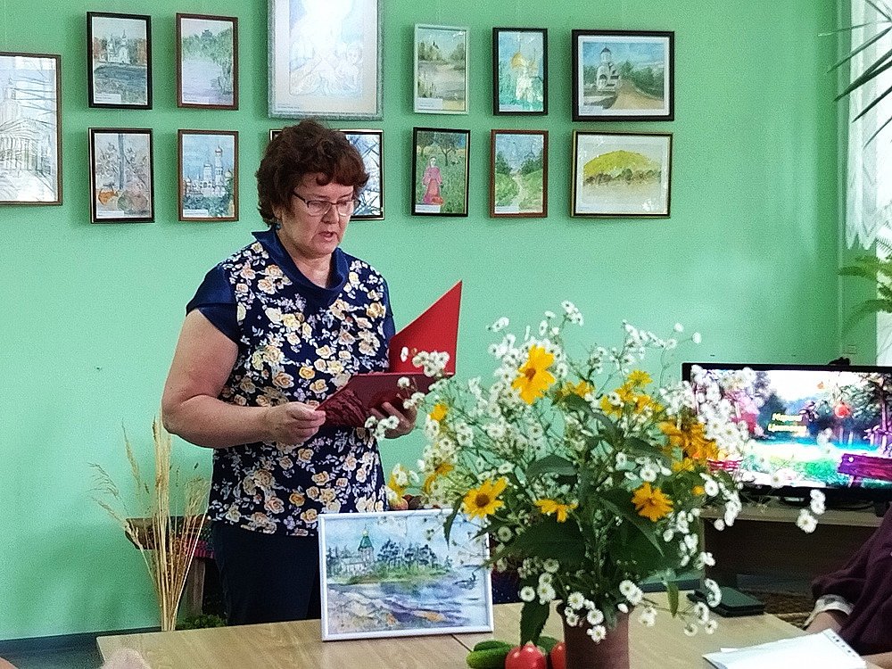 Участницы выставки прослушали музыкальную композицию на стихи Марины Цветаевой «Август». Стихотворения, посвященные последнему месяцу лета и праздникам, прочли Лилия Викторова и Валентина Гребенюк.