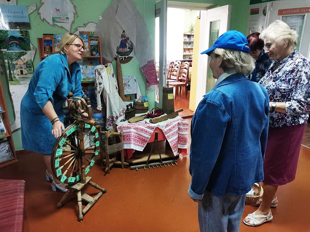 Для взрослых были организованы мероприятия “Вяртанне да вытокаў” и “Бібліятэчная вандроўка”. “Вяртанне да вытокаў” – этнографитческий уголок, где были представлены старинные предметы быта, одежды. Благодаря экспозиции наши гости окунулись в прошлое: вспоминали, как жили их бабушки и дедушки. В этом им помогли старинные экспонаты библиотечного этнографического уголка: деревянные и металлические изделия, утюг, маслобойка, прялка и многие другие вещи.