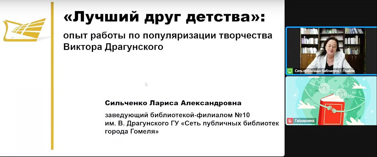 В рамках модуля «Библиотечные имена: опыт регионов» онлайн к российским коллегам присоединилась заведующий филиалом детской библиотеки-филиала №10 им. В. Драгунского ГУ «Сеть публичных библиотек города Гомеля» Лариса Александровна Сильченко. Она рассказала о мероприятиях и проектах библиотеки-филиала и всего учреждения, которые помогают сделать творчество Виктора Драгунского более привлекательным и понятным для современных детей. Это не просто чтение книг, а целая система мероприятий, направленных на погружение в мир героев: фестиваль детской книги «Лучший друг детства», проект «“Денискины рассказы”: путешествие во времени», в рамках проекта – городской конкурс детских рисунков «Где это видано, где это слыхано…» и создание видеоэкскурсий по экспозициям библиотек, которые носят имя Виктора Драгунского, и др.