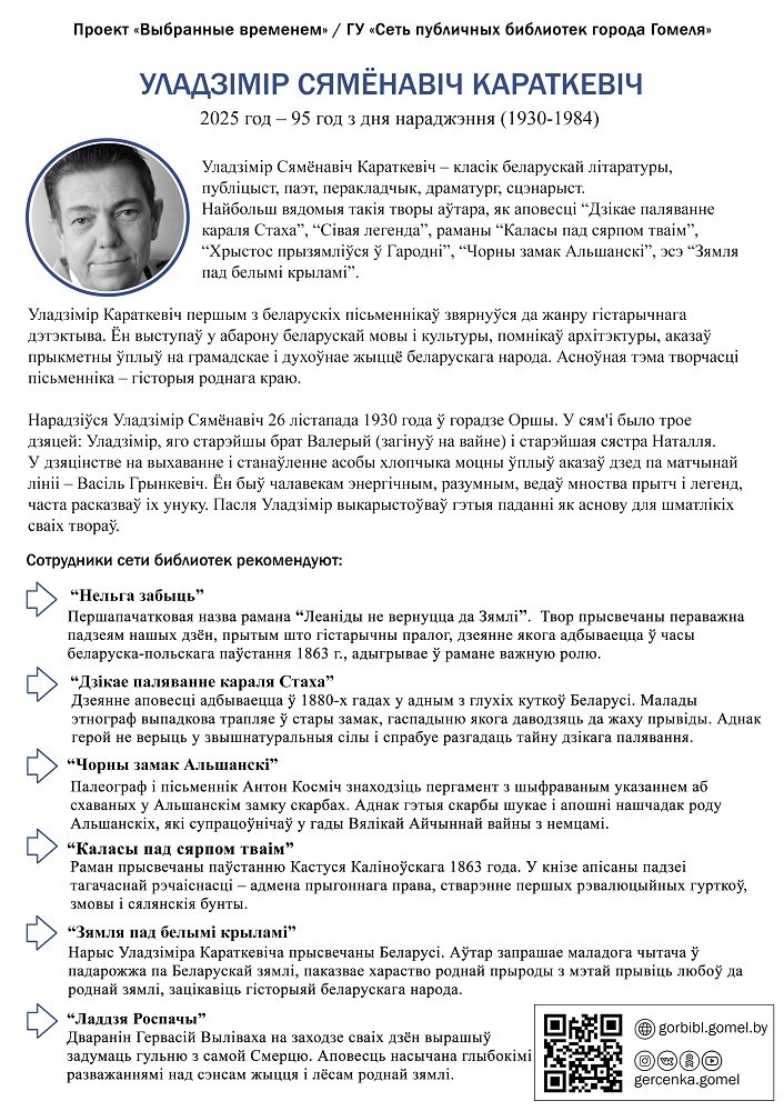 В 2025 году исполняется 95 лет со дня рождения классика белорусской литературы, поэта, переводчика, публициста, драматурга и сценариста Владимира Семёновича Короткевича.Владимир Короткевич – одна из самых ярких фигур белорусской литературы XX века. Он стал первым белорусским писателем, обратившимся к жанру исторического детектива.