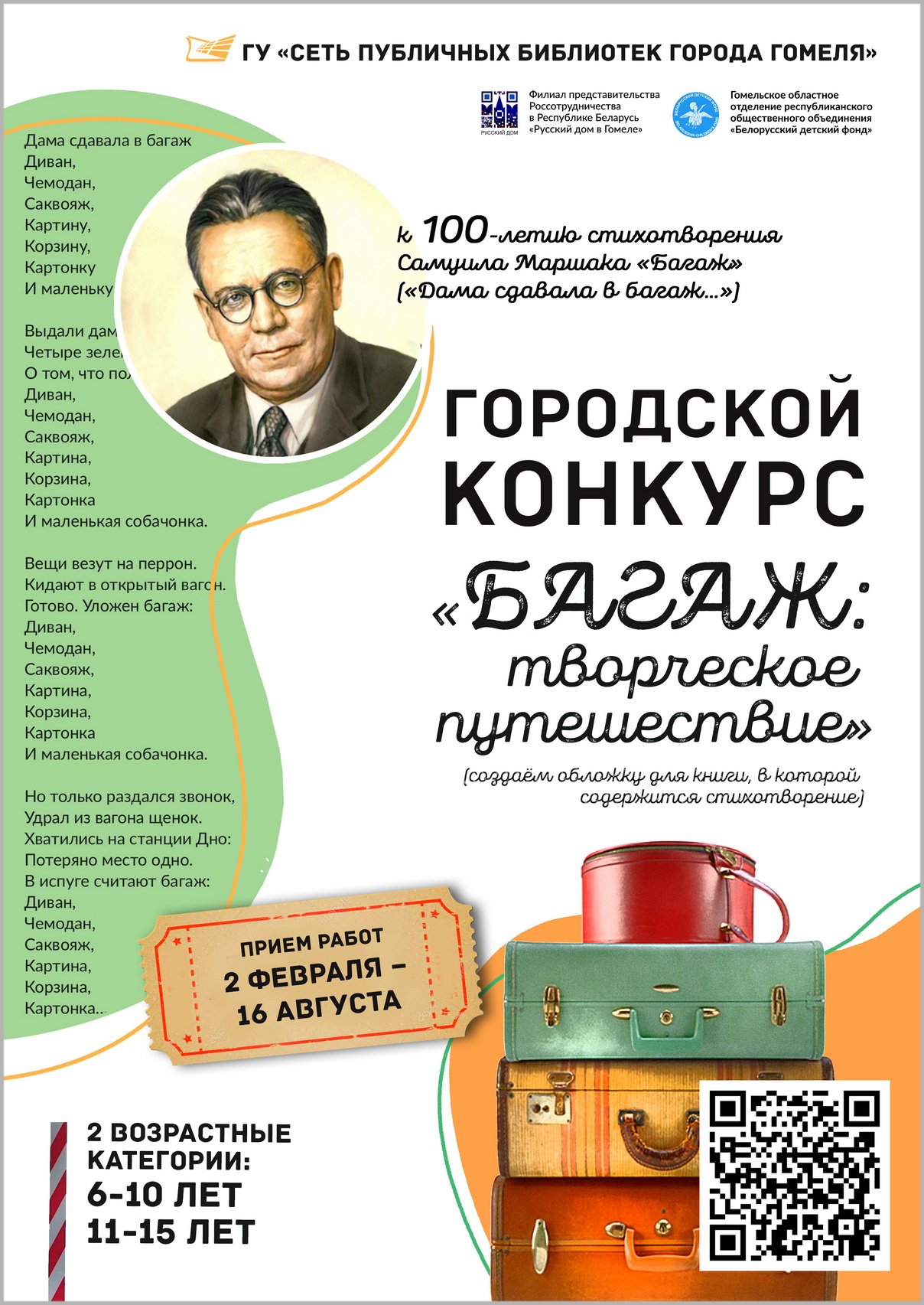 к 100-летию стихотворения Самуила Маршака «Багаж» запускает городской конкурс «Багаж: творческое путешествие».Соучредителями конкурса выступают филиал представительства Россотрудничества в Республике Беларусь «Русский дом в Гомеле» и Гомельское областное отделение республиканского общественного объединения «Белорусский детский фонд».
