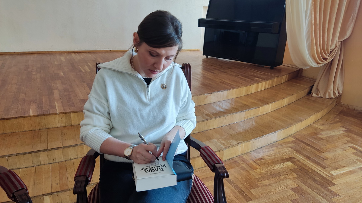 Также Янина Корбут подарила библиотеке свою новую книгу «Елена Прекрасная и город на крови» с дарственной надписью и автографом.
