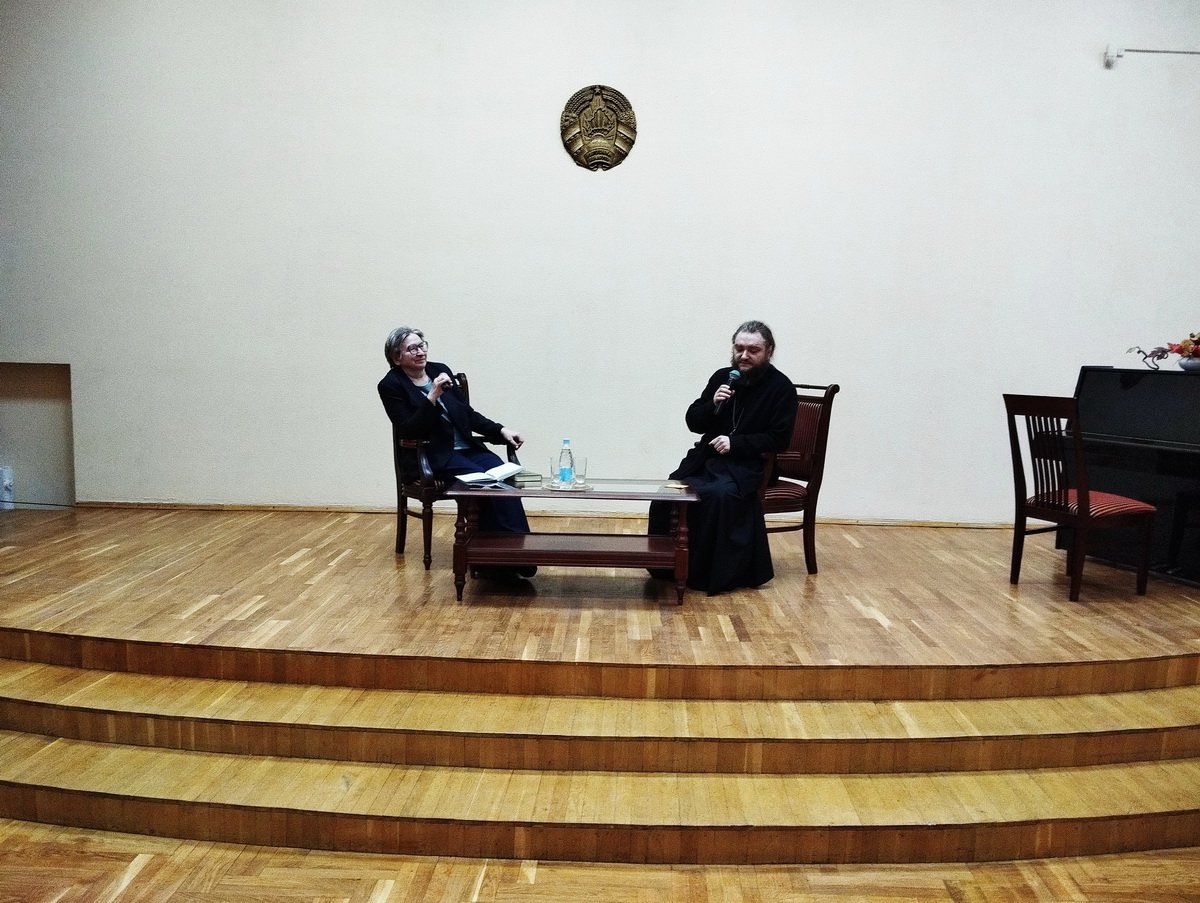 В начале мероприятия Татьяна Николаевна и отец Савва обсудили биографию писателя.