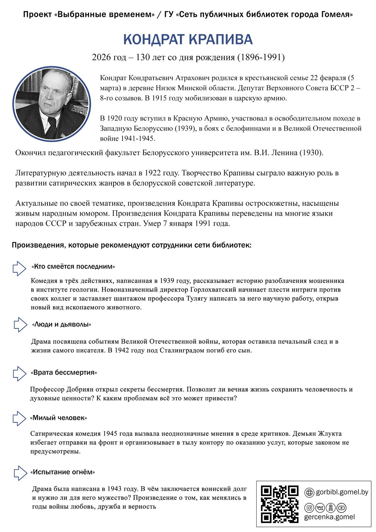 В 2026 году исполняется 130 лет со дня рождения белорусского советского писателя, поэта, драматурга и переводчика, литературоведа, сатирика, общественного деятеля, академика АН Белорусской ССР Кондрата Крапивы.