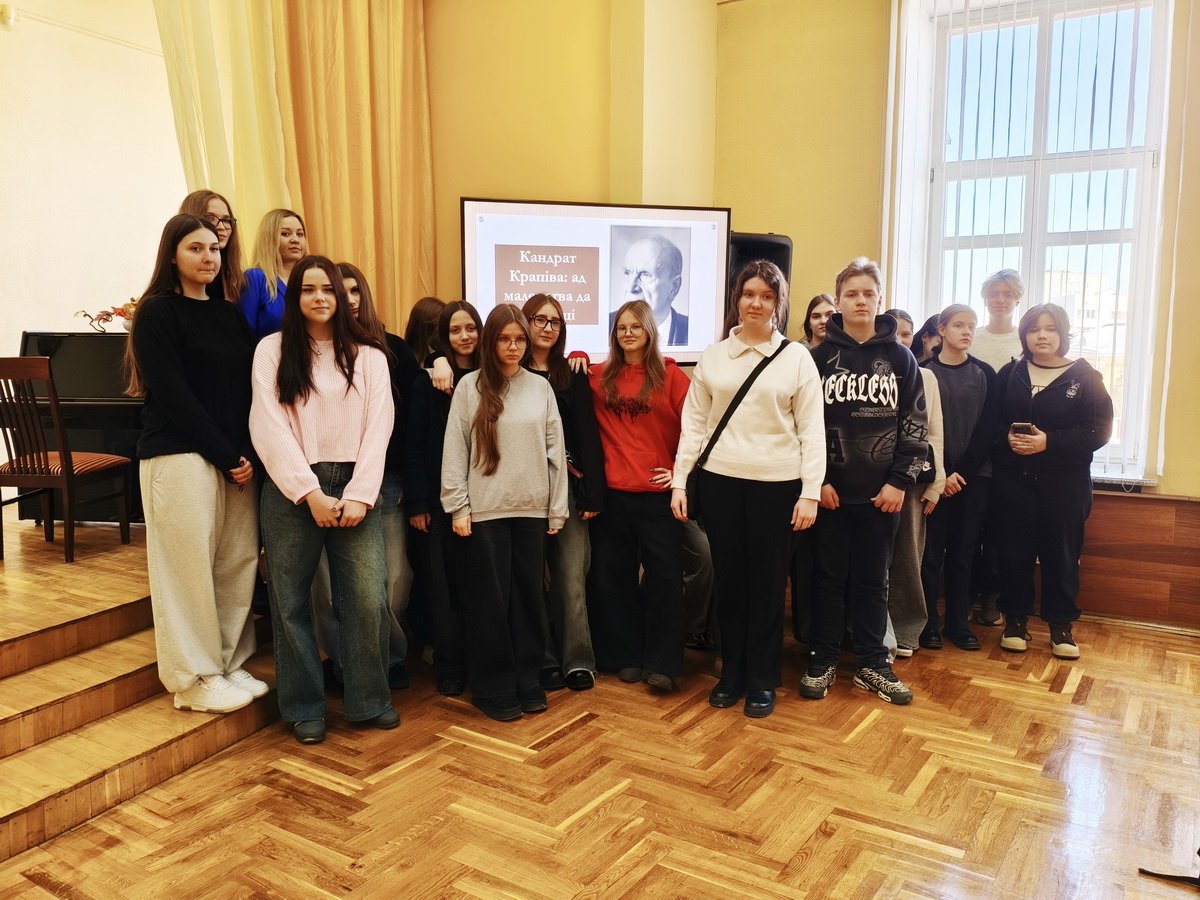 Госці пазнаёміліся з літаратурнымі творамі пісьменніка. Хлопцы і дзяўчаты ўспаміналі байкі Кандрата Крапівы, ў назвы баек устаўлялі прапушчаныя словы. Была праслухана адна з самых вядомых баек пісьменніка “Дыпламаваны баран”. Вучні паразважалі, якія чалавечыя недахопы высмейвае пісьменнік, і чаму байка вучыць чытачоў. Быў прагледзены ўрывак з камедыйнага фільма “Хто смяецца апошнім”, знятага па матывах аднайменнай сатырычнай п’есы.