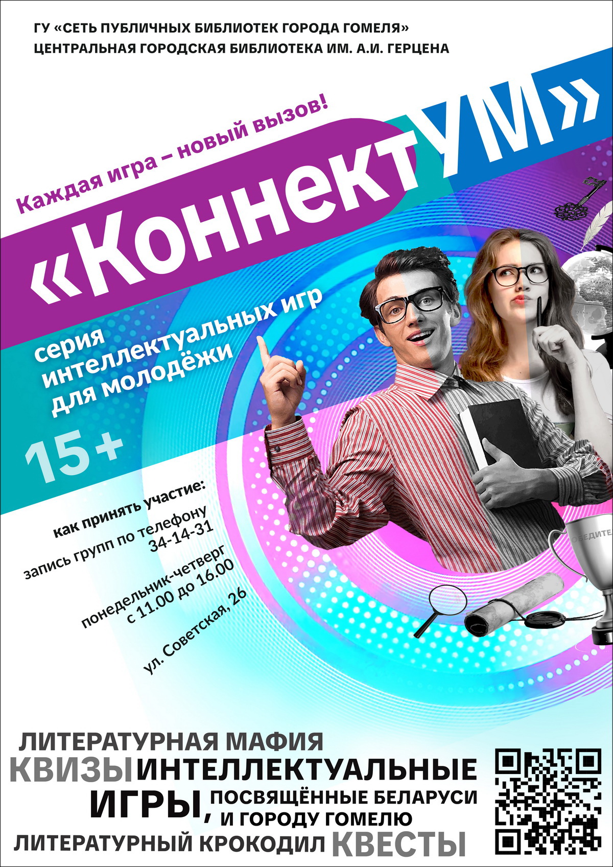 Каждый месяц «КоннектУМ» представляет новую игру. В течение года участников ждут интеллектуальные турниры, квизы, квесты, детективные расследования, творческие задания и многое другое. Чтобы не пропустить старт новой игры, предлагаем следить за анонсами на сайте учреждения и в социальных сетях.