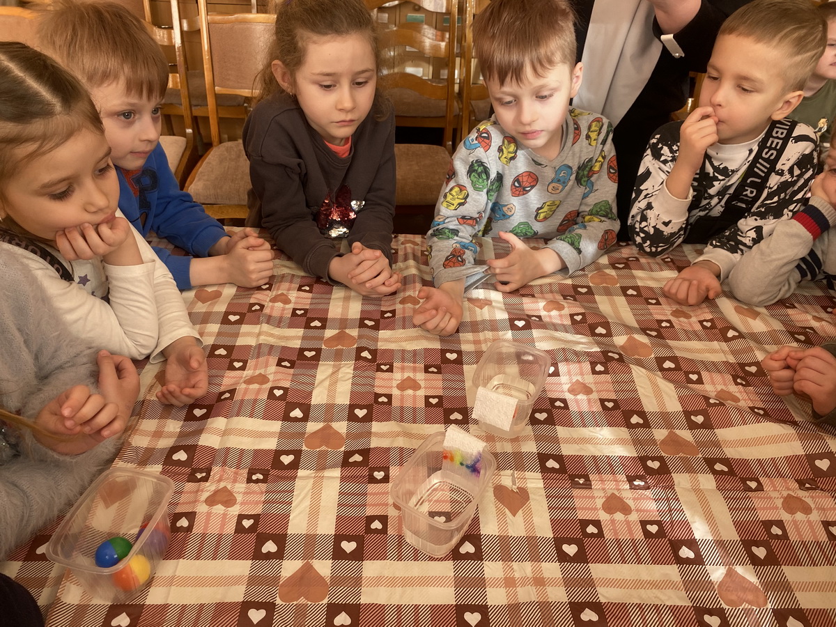 Юные исследователи с большим интересом приняли участие в серии занимательных опытов. Первые эксперименты были посвящены физическим свойствам воды: ребята убедились в её прозрачности и выяснили, почему одни предметы тонут, а другие остаются на поверхности. С помощью красок дошкольники превратили бесцветную жидкость в разноцветную, сделав вывод, что вода легко окрашивается.