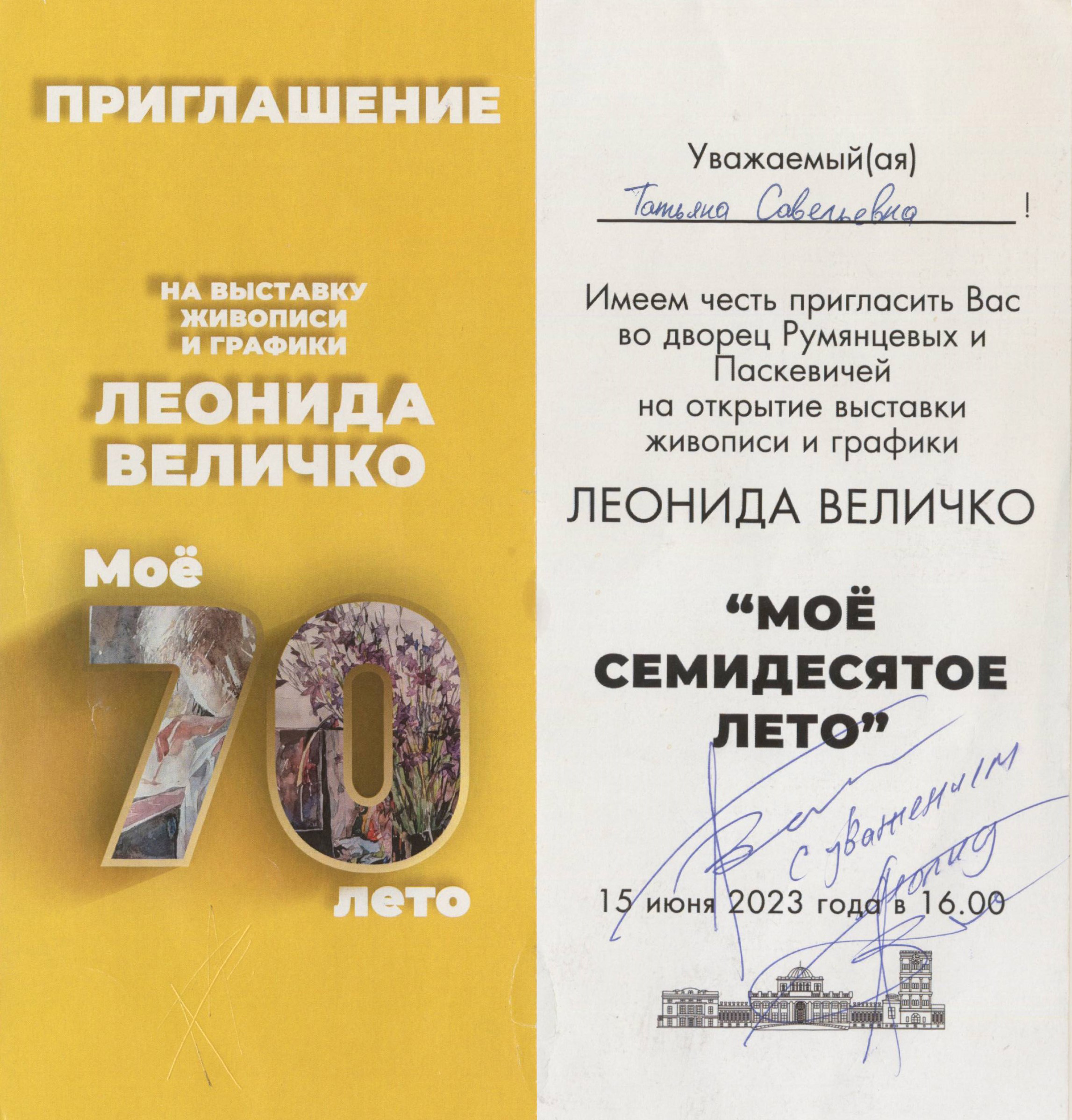 В июле 2023 года в центральной части дворца Румянцевых и Паскевичей открылась выставка живописи и графики Леонида Величко «Моё семидесятое лето», посвященная 70-летию художника.