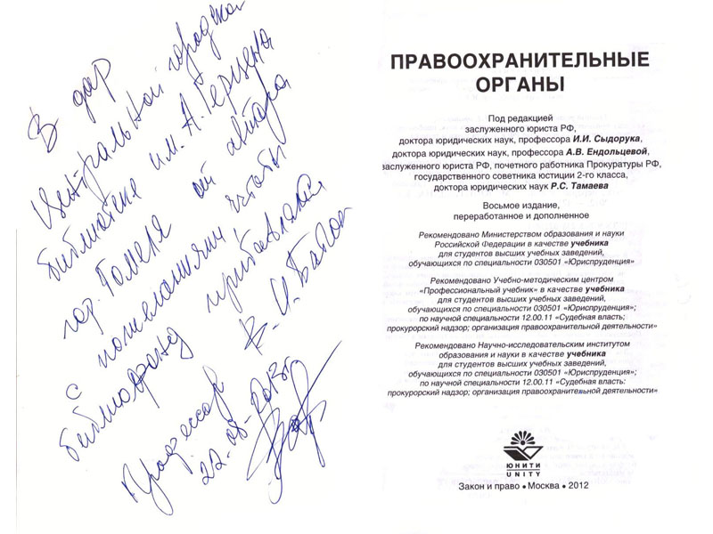 Правоохранительные органы: учебник для студ. вузов, обучающихся по спец. «Юриспруденция» / под ред. И. И. Сыдорука, А. В. Ендольцевой, Р. С. Тамаева. – 8-е изд., перераб. и доп. – Москва: Юнити-Дана: Закон и право, 2012. – 471 с.