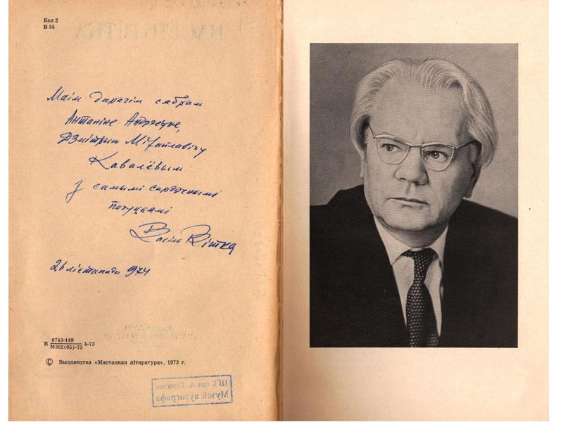 Маім дарагім сябрам Антаніне Андрэеўне, Дзмітрыю Міхайлавічу Кавалёвым з самымі сардэчнымі пачуццямі Васіль Вітка 26 лістапада 1974.
