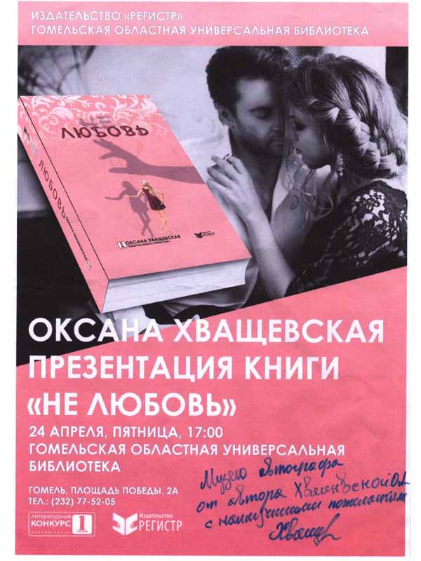 Оксана Хващевская. Презентация книги «Нелюбовь» [Изоматериал] : 24 апреля, пятница, 17:00, Гомельская областная библиотека : [афиша] / Издательство «Регистр», Гомельская областная универсальная библиотека им. В.И. Ленина. – [Б. м.: б. и., 2015]. – 1 л.