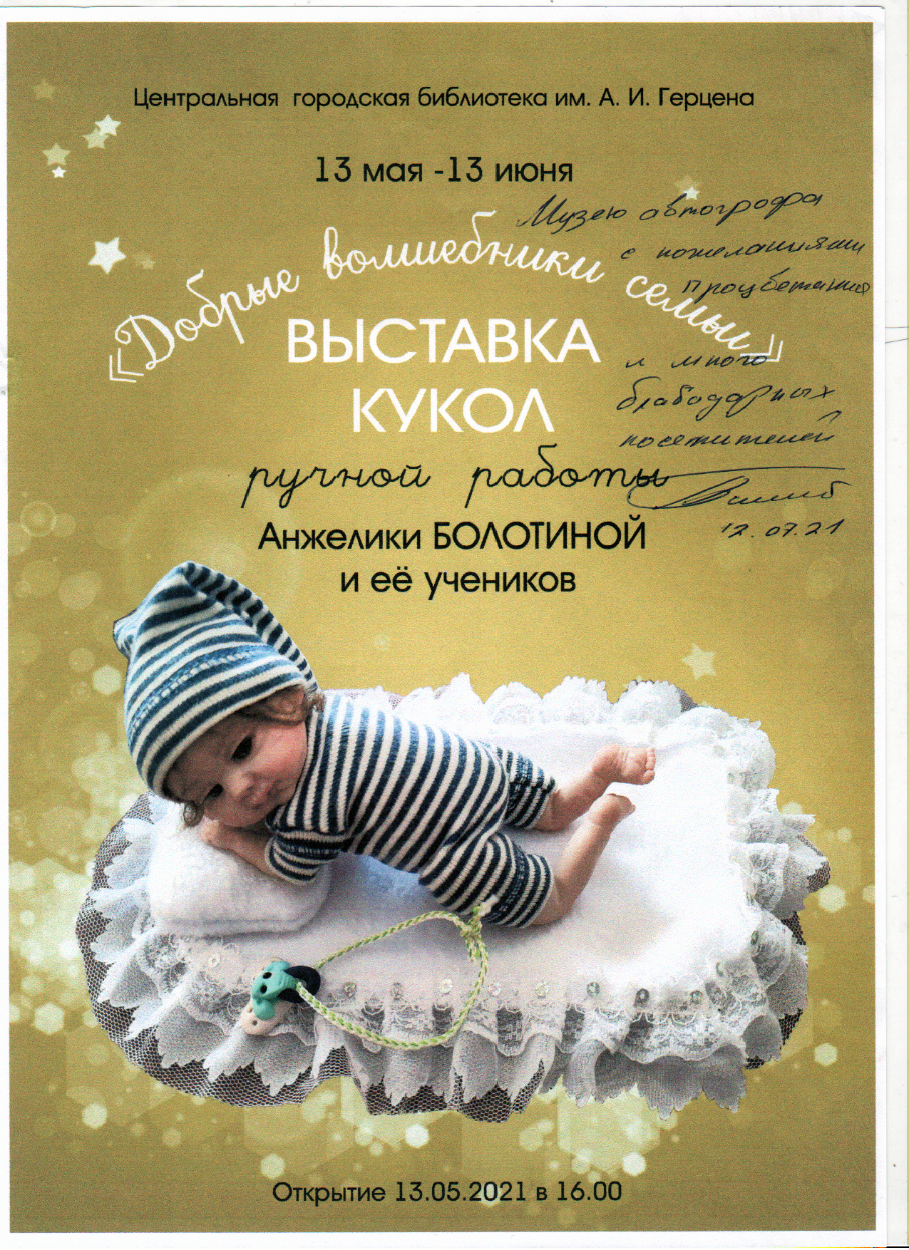 В 2021году в Музее автографа центральной городской библиотеки им. А.И. Герцена состоялось открытие выставки кукол «Добрые волшебники семьи» педагога УО «Центр творчества детей и молодежи Новобелицкого района Гомеля» Анжелики Болотиной и её учеников.