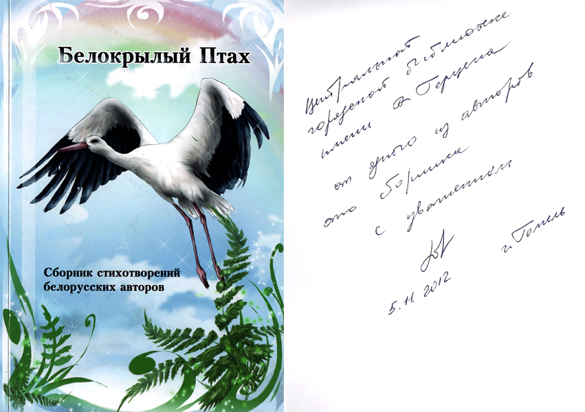 Центральной городской библиотеке им. А. Герцена от одного из авторов этого сборника с уважением /Подпись/ 5.11.2012 г. Гомель
