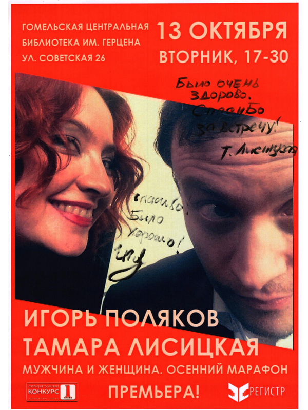 Автограф был дан на встрече с Тамарой Лисицкой и Игорем Поляковым (литературно-музыкальная программа «Мужчина и женщина. Осенний марафон»).