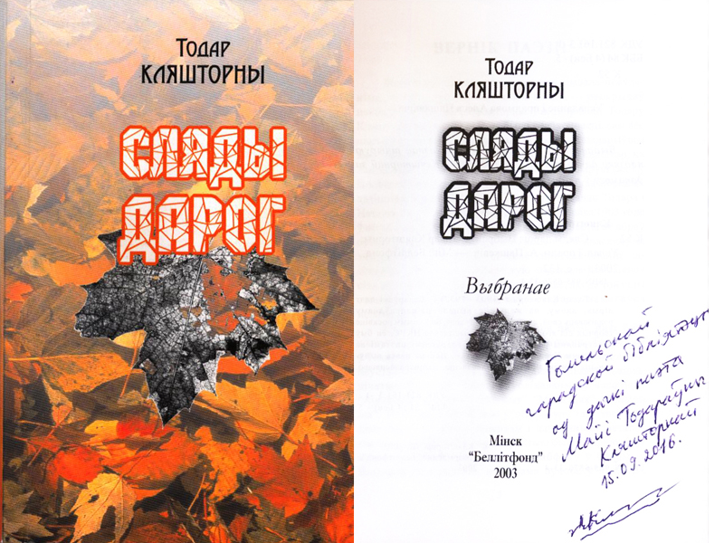 Гомельскай гарадской бібліятэцы ад дачкі паэта Майі Тодараўны Кляшторнай. 15. 09. 2016. Подпись.