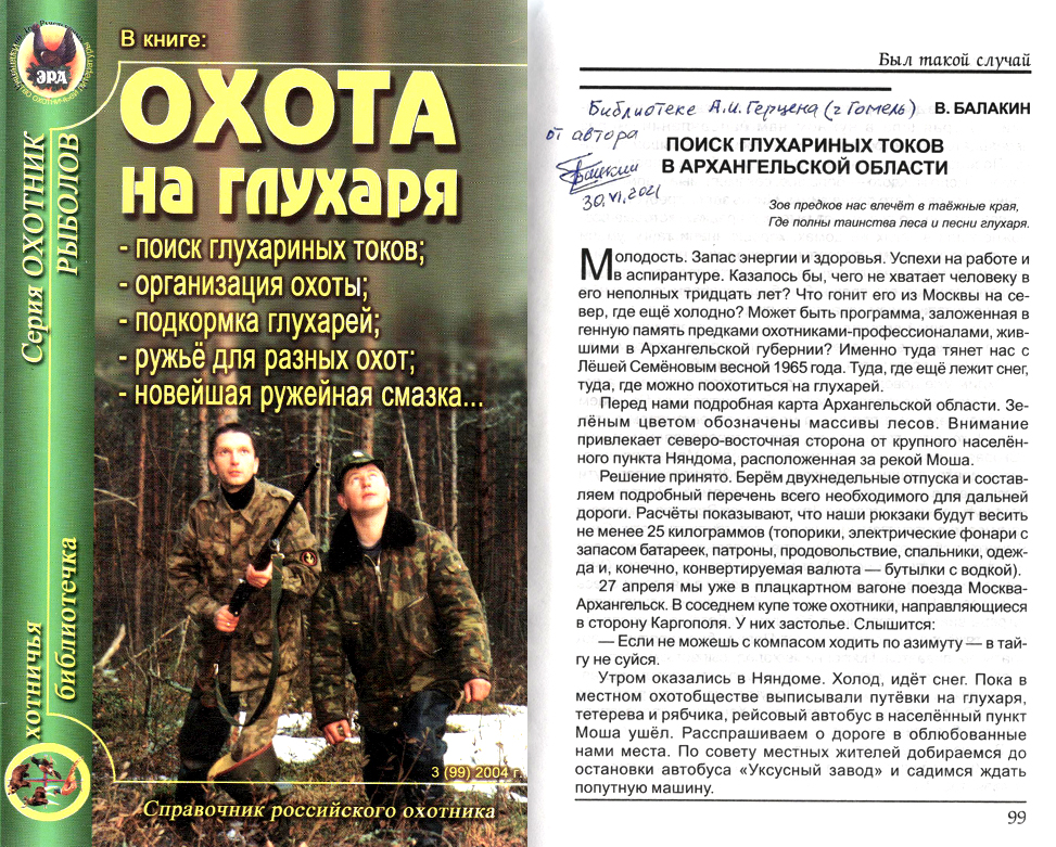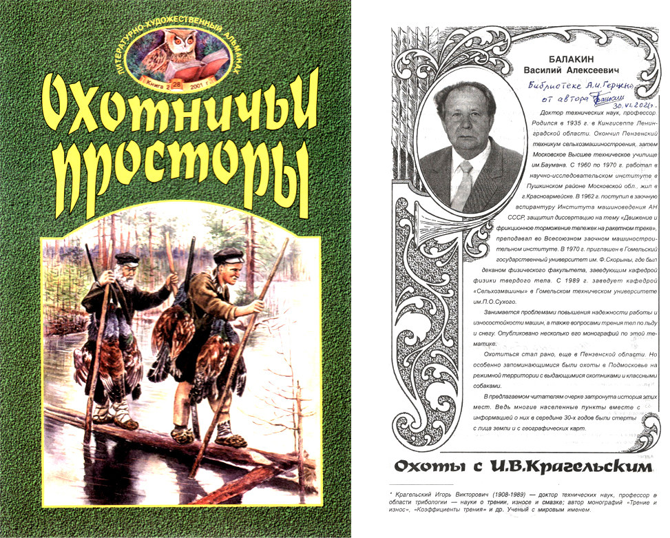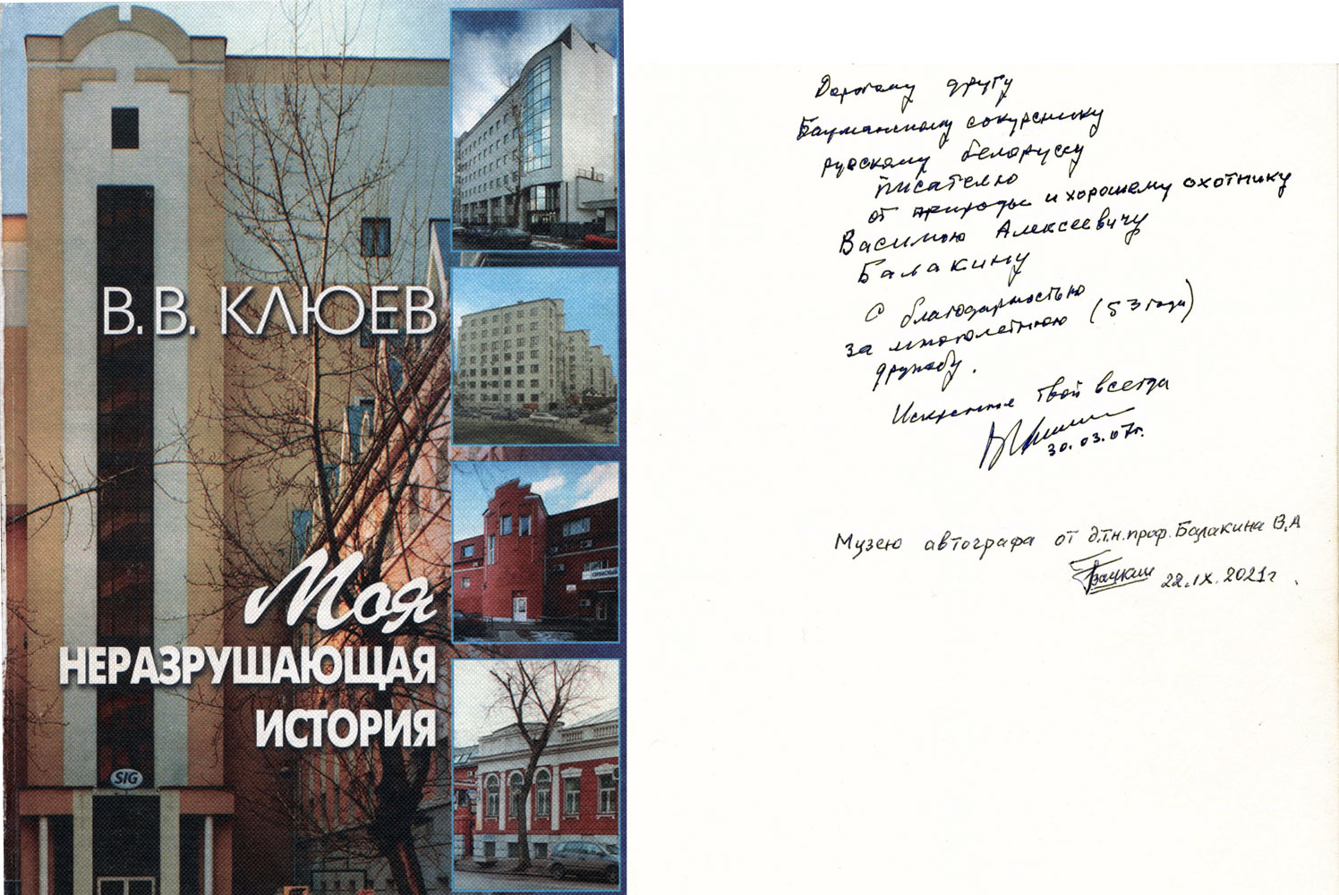 Дорогому другу, Бауманскому сокурснику русскому белорусу писателю от природы и хорошему охотнику Василю Алексеевичу Балакину С благодарностью за многолетнюю (53 года) дружбу. Искренне твой навсегда подпись 30.03.07г. Музею автографа от д.т.н., проф. Балакина В.А. 22.IX.2021, подпись