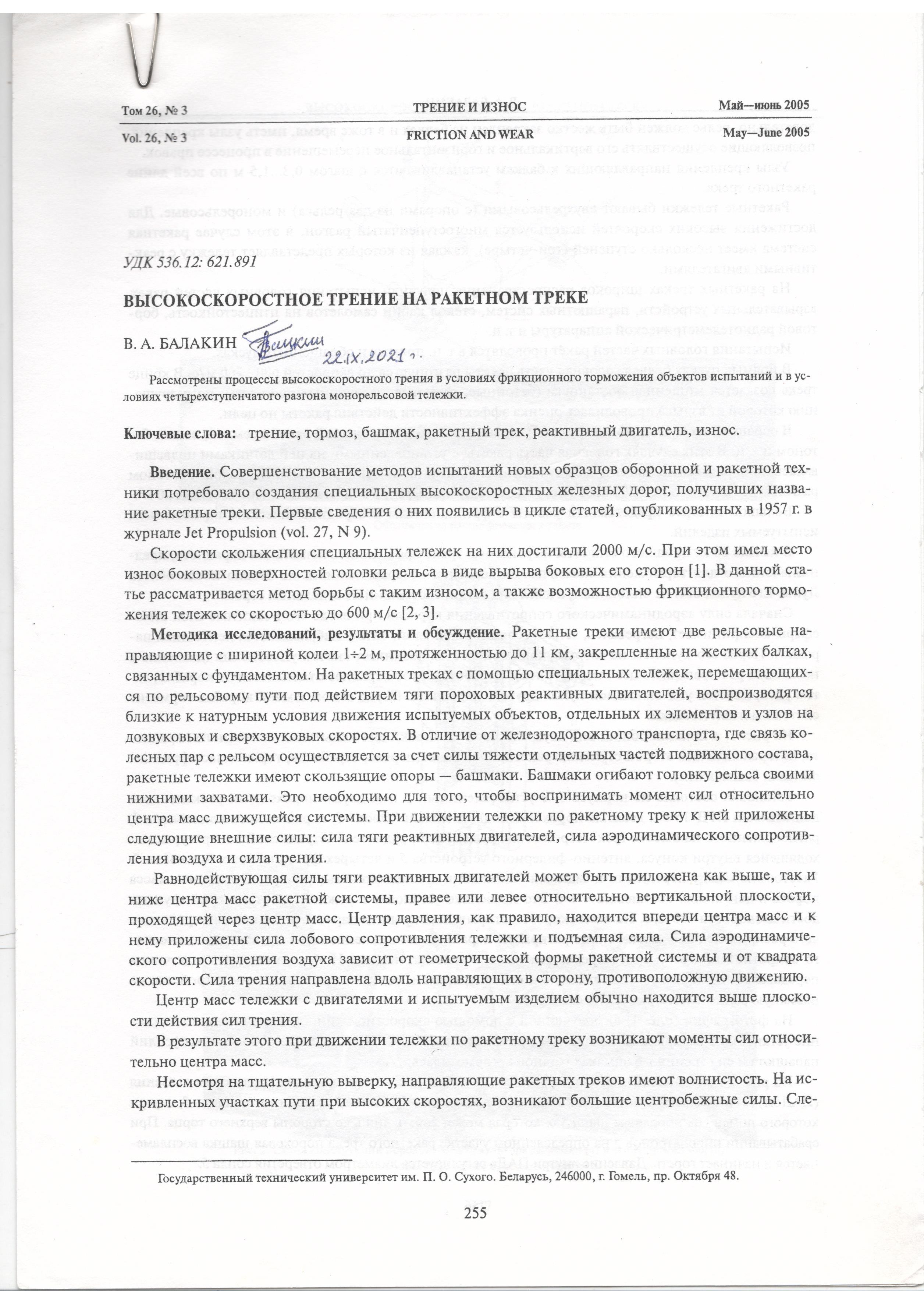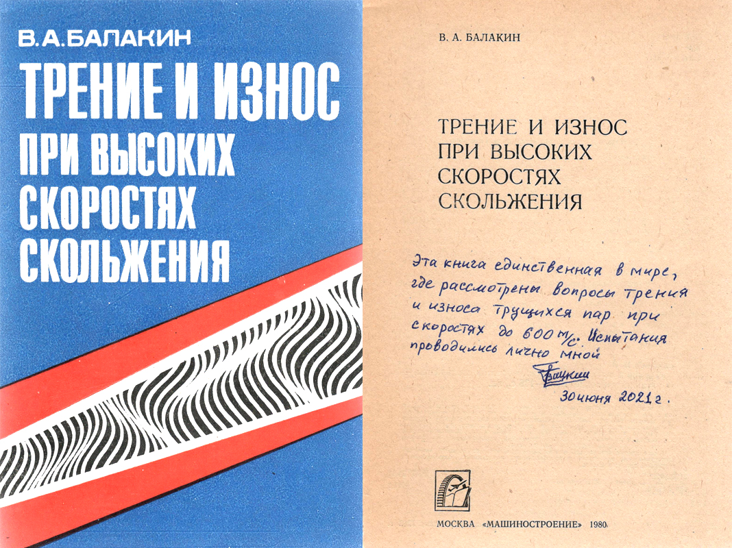Эта книга единственная в мире, где рассмотрены вопросы трения и износа трущихся пар при скоростях до 600 м/с. Испытания проводились лично мной /Подпись/ 30 июня 2021 г.