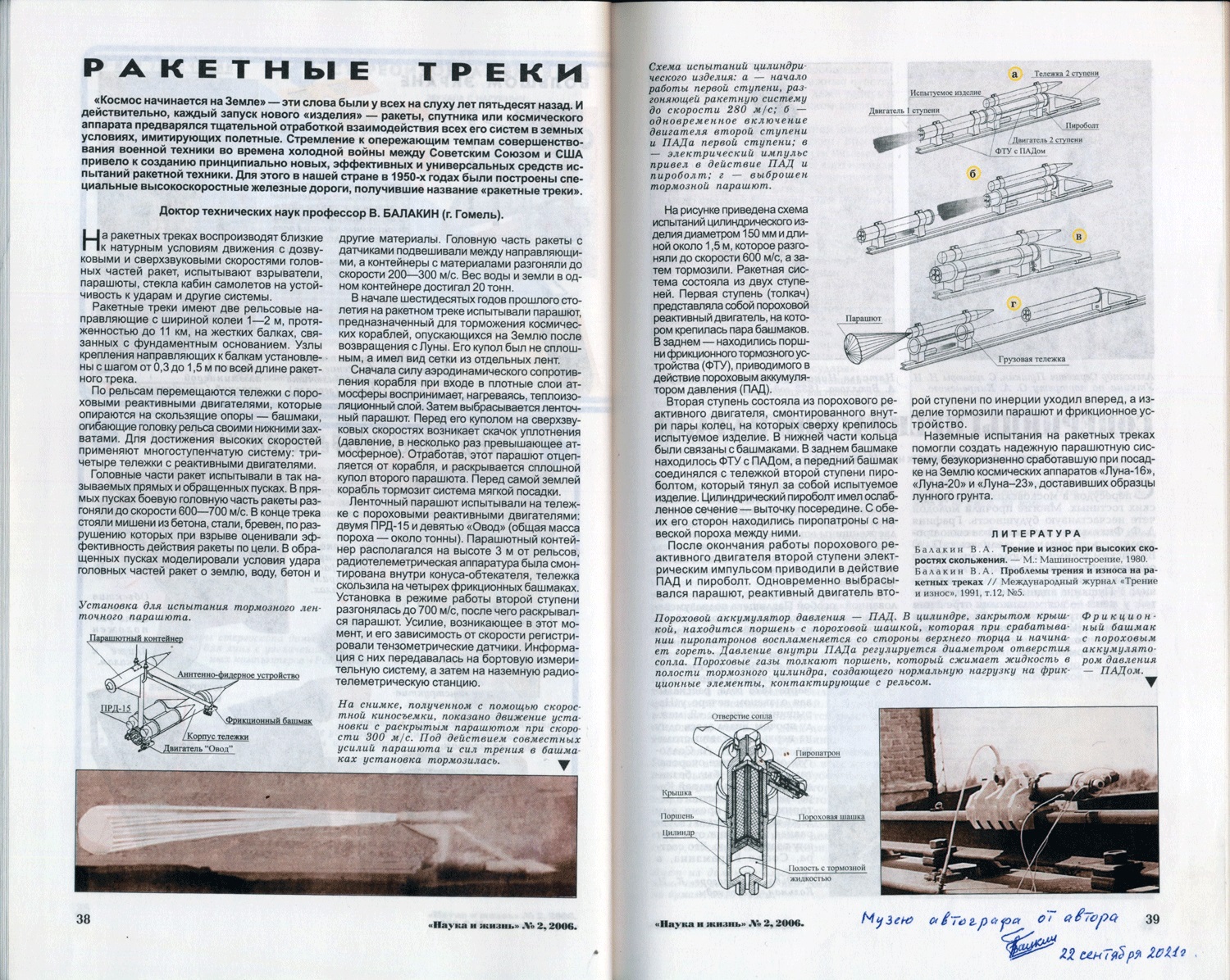 Балакину Василию Алексеевичу, выпускнику боеприпасной кафедры МВТУ им. Н. Э. Баумана, с глубоким уважением и на добрую память. Подпись (Ладов С.В.) Музею автографа от д.т.н., проф. Балакина В.А. 22.IX.2021, подпись