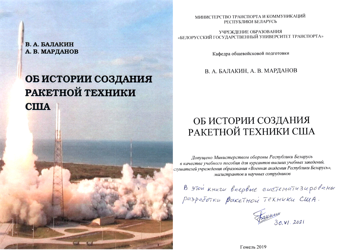 В этой книге впервые систематизированы разработки ракетной техники США. /Подпись/ 30.VI.2021 г.
