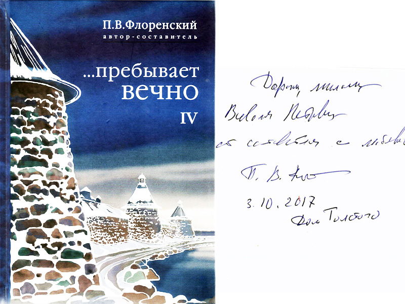 «Дорогому, милому Всеволоду Петровичу от составителя с любовью /Подпись/ 3.10.2017. Дом Толстого /Дарственная надпись адресована Всеволоду Петровичу Потерухину, уроженцу Гомеля, полковнику в отставке, одному из старейших деятелей Русского Дворянского Собрания/»
