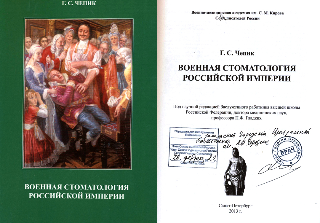 Чепик Г. Военная стоматология российской империи / Георгий Чепик; Военно-медицинская академия им. С. М. Кирова; Союз писателей России; под ред. П. Ф. Гладких. – Санкт-Петербург, 2013. – 423 с.