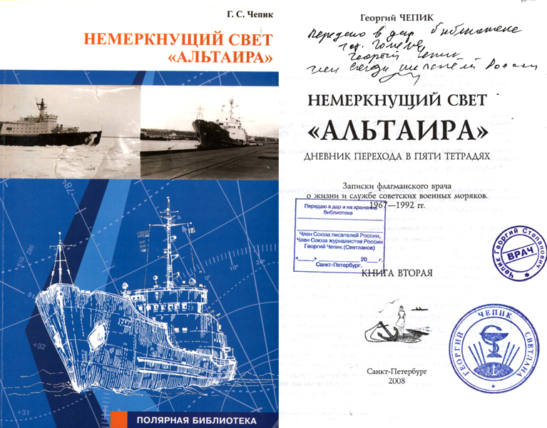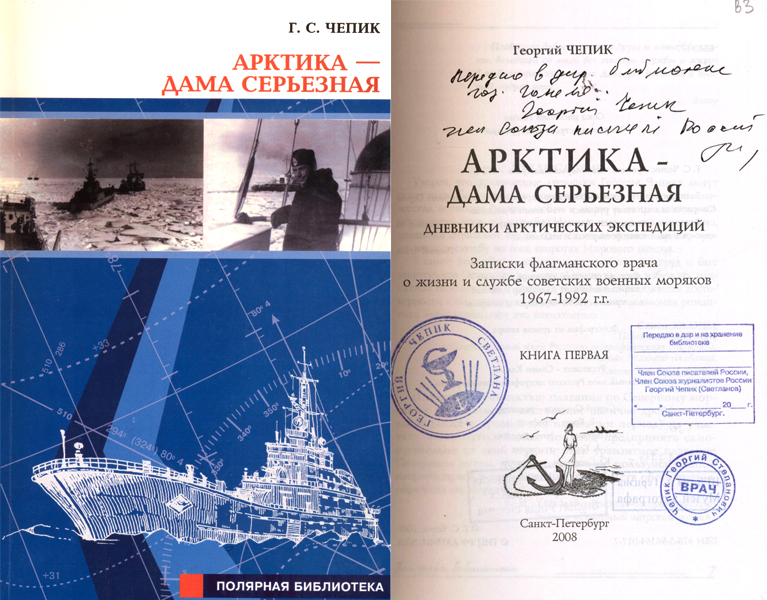Чепик Г. Арктика – дама серьезная : дневники арктических экспедиций : записки флагманского врача о жизни и службе советских военных моряков 1967-1992 гг. – Кн. 1 / Георгий Чепик. – Санкт-Петербург, 2008. – 166 с.