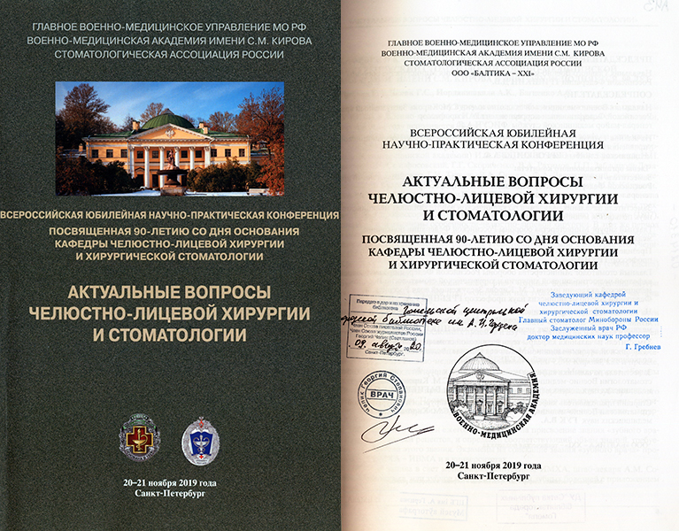 Актуальные вопросы челюстно-лицевой хирургии и соматологии : Всероссийская юбилейная научно-практическая конференция, посвященная 90-летию со дня основания кафедры челюстно-лицевой хирургии и хирургической стоматологии, 20-21 ноября 2019 года / Главное Военно-медицинское управление МО РФ ; Военно-медицинская академия им. С. М. Кирова ; Стомалогическая Ассоциация России ; ООО "Балтика" -ХХI". - Санкт-Петербург : ВМедА, 2019. - 159 с.