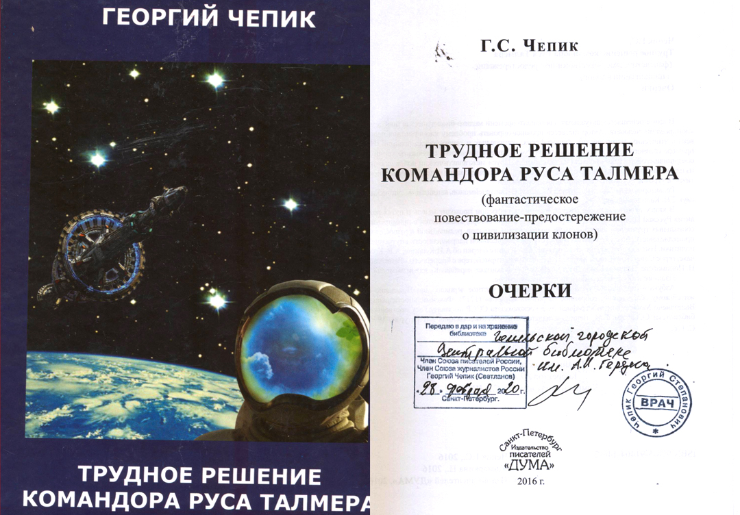 Чепик Г. Трудное решение командора Руса Талмера : фантастическое повествование-предостережение о цивилизации клонов : очерки / Георгий Чепик . – Санкт-Петербург : Дума, 2016. – 269 с.