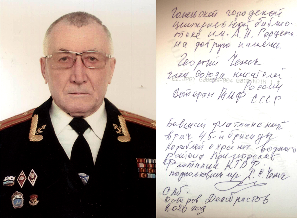 Гомельской городской центральной библиотеке им. А.И. Герцена на добрую память. Георгий Чепик член Союза писателей России, Ветеран ВМФ России. Бывший флагманский врач 45-й бригады кораблей охраны водного района Приморской Флотилии КТРФ. Подполковник м/с Г.С. Чепик. СКб. Остров Декабристов 2020 год