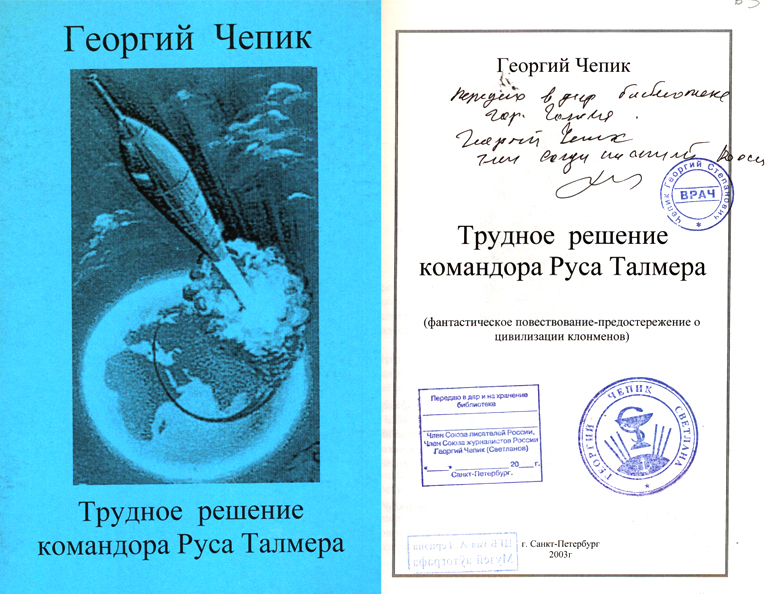 Чепик Г. Трудное решение командора Руса Талмера : фантастическое повествование-предостережение о цивилизации клонменов / Георгий Чепик. – Санкт-Петербург, 2003. – 43 с.