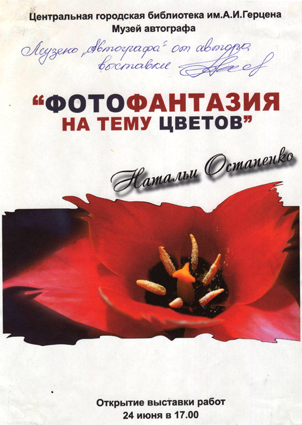 Неоднократно показывала свои работы в музее автографа центральной городской библиотеки им А.И. Герцена (персональная выставка «Фотофантазия на тему цветов» (2014 г.), совместная выставка с Александрой Макаренко «Дыша духами и туманами» (2020 г.).