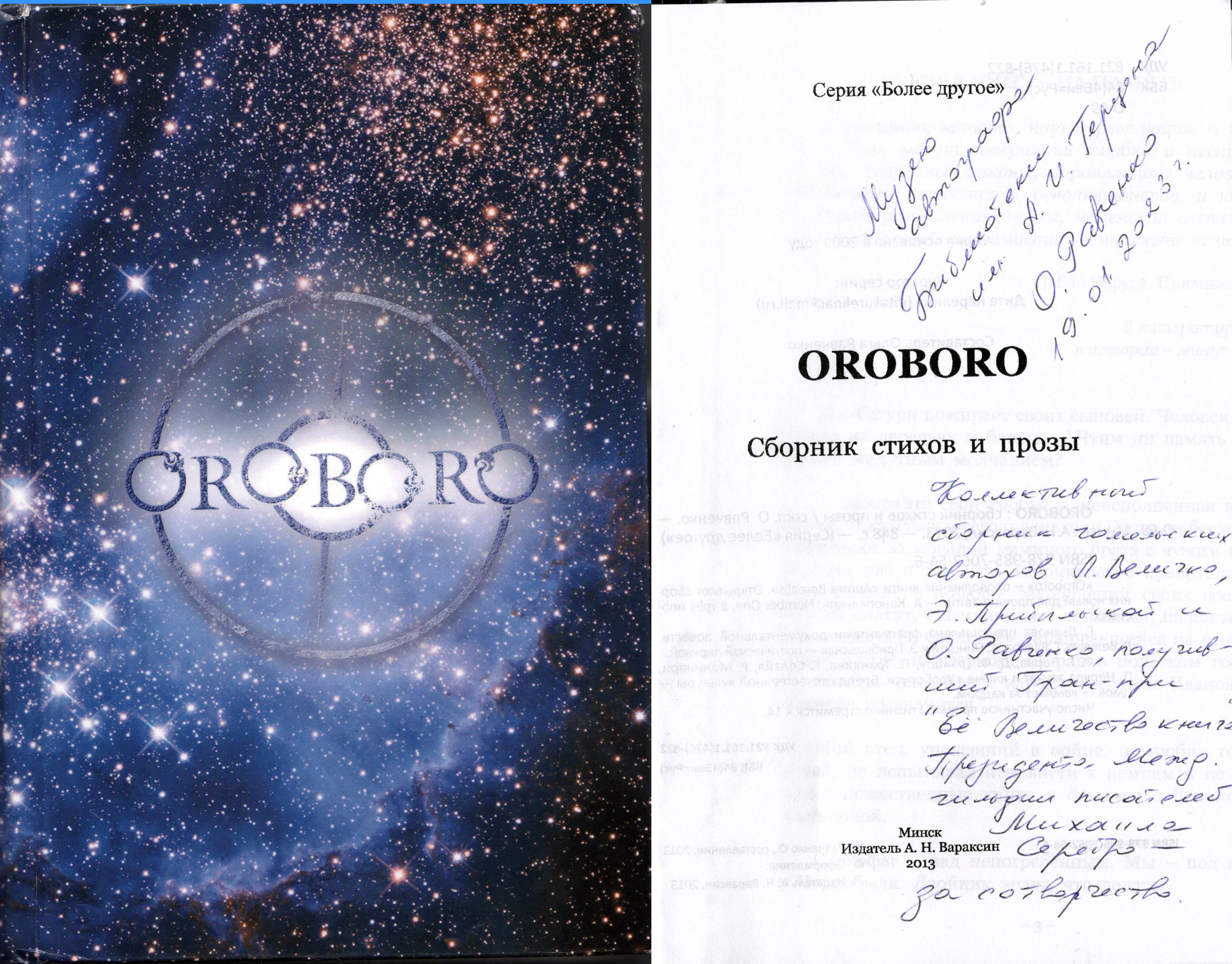 Обладатель Гран-при «Её Величество книга!» Президента Международной гильдии писателей в номинации «Сотворчество» за коллективный сборник “OROBORO”.