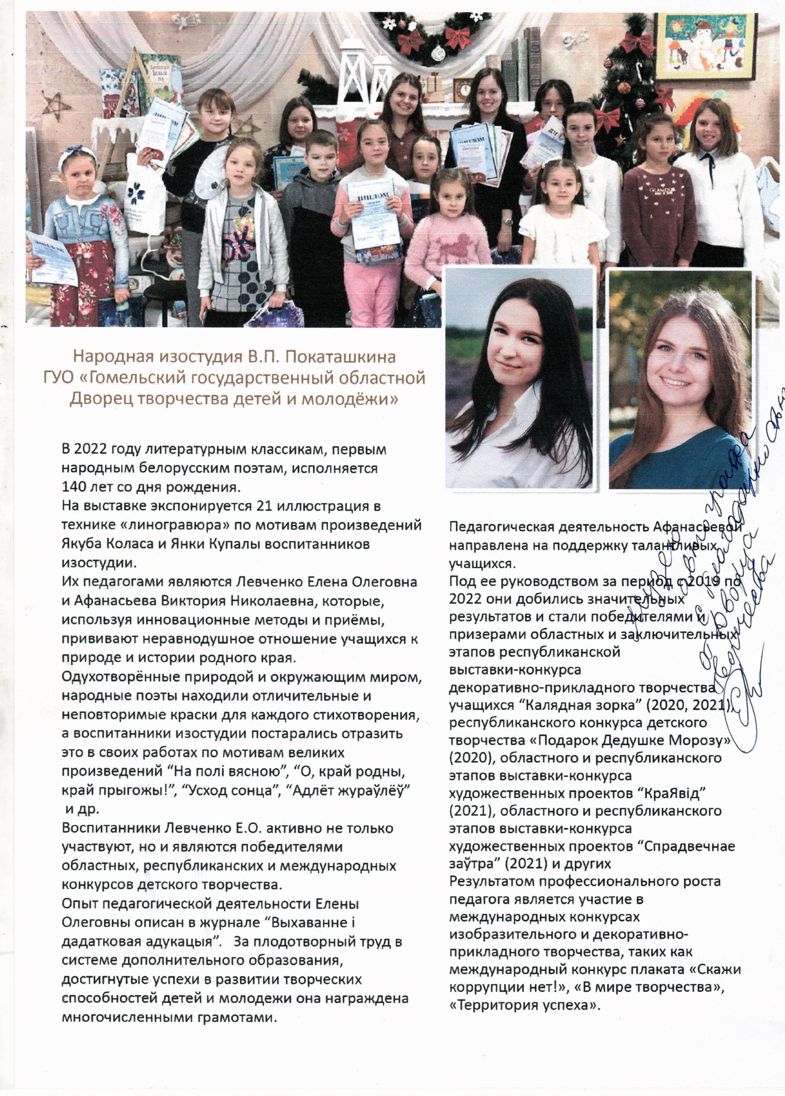 Левченко Елена работает в ГУО «Гомельский государственный областной Дворец творчества детей и молодёжи» с 2016 года одним из педагогов Студии изобразительного искусства В.П. Покаташкина.