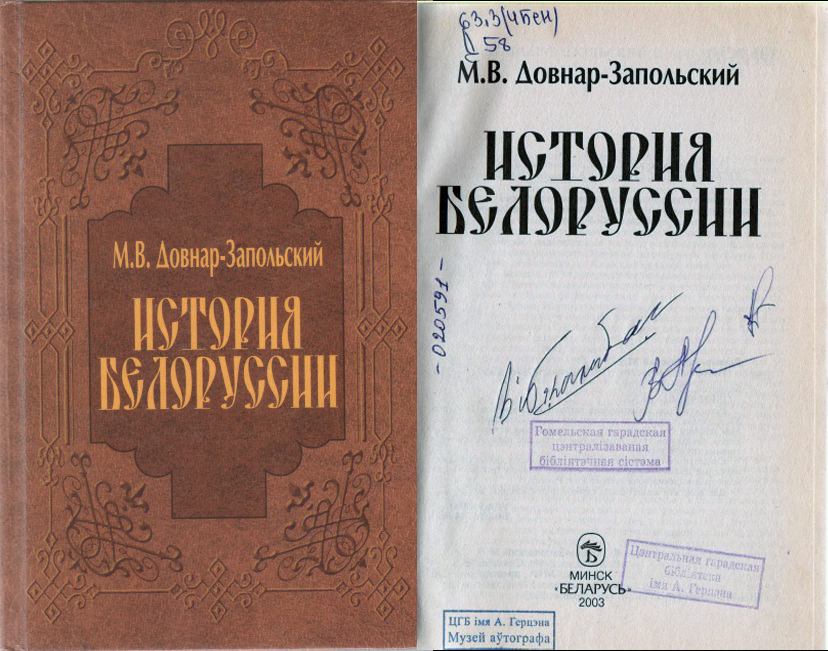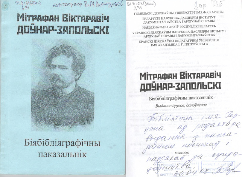 «Бібліятэцы імя Герцэна ад рэдактара выдання з пажаданнем поспехаў і падзякай за супрацоўніцтва. 30.04.08 /подпись/»