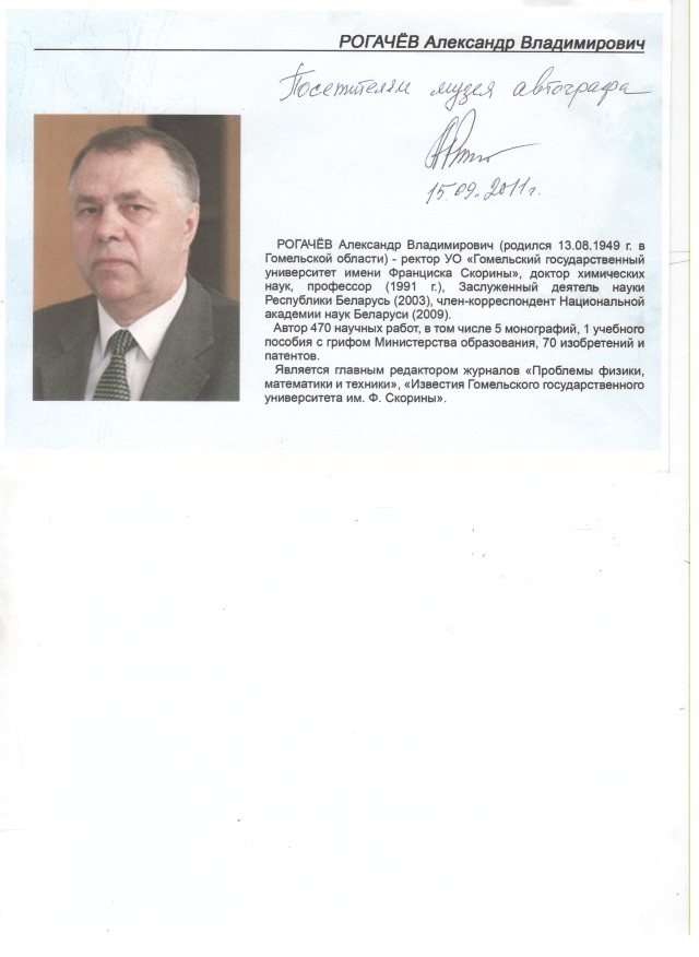 Рогачёв Александр Владимирович (род. 13.08.1949 г., д. Юрковичи Ветковского района Гомельской области) – доктор химических наук (1989), профессор (1991), заслуженный деятель науки Республики Беларусь (2003), член-корреспондент НАН Беларуси (2009 г.)
