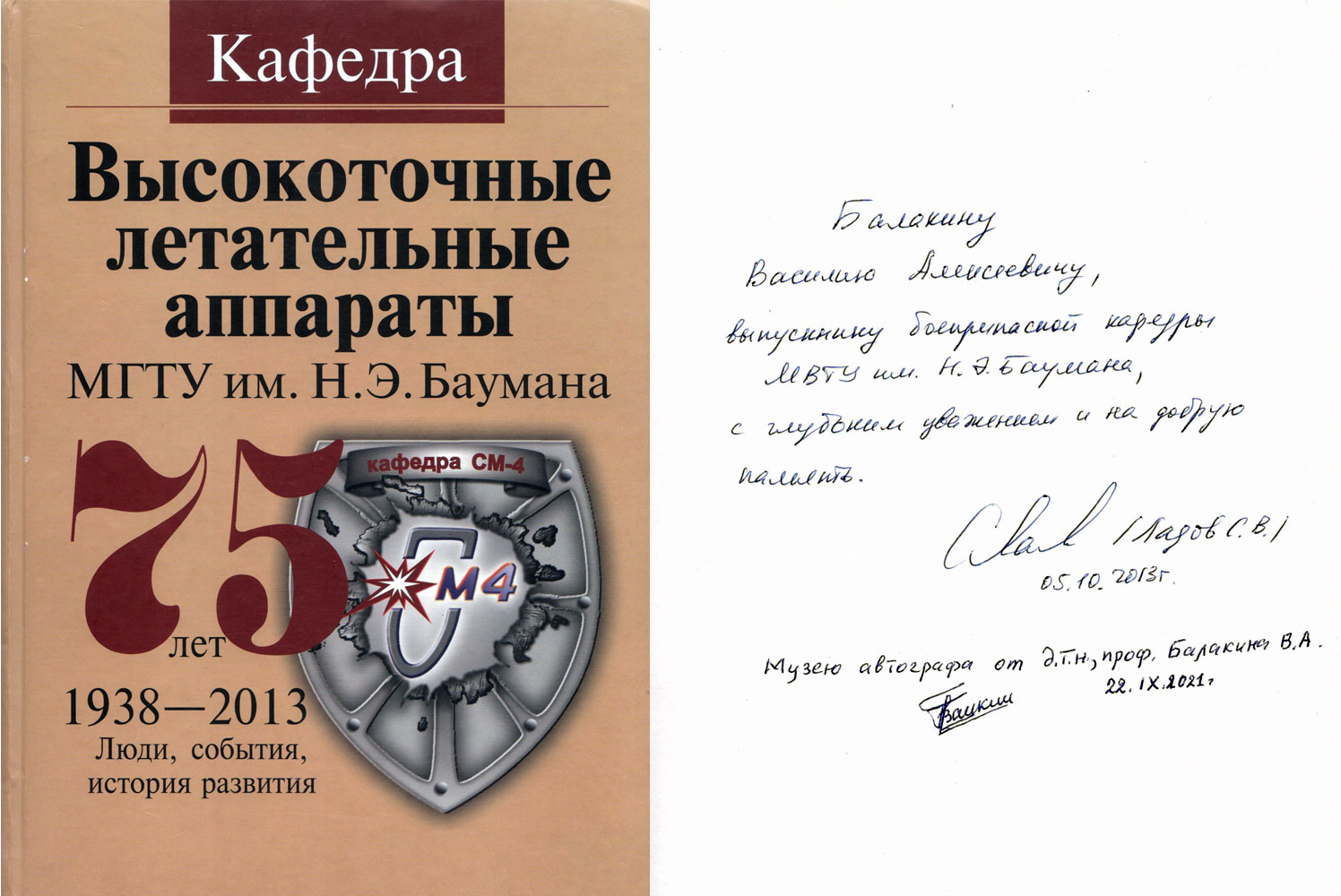 Балакину Василию Алексеевичу, выпускнику боеприпасной кафедры МВТУ им. Н. Э. Баумана, с глубоким уважением и на добрую память. Подпись (Ладов С.В.)