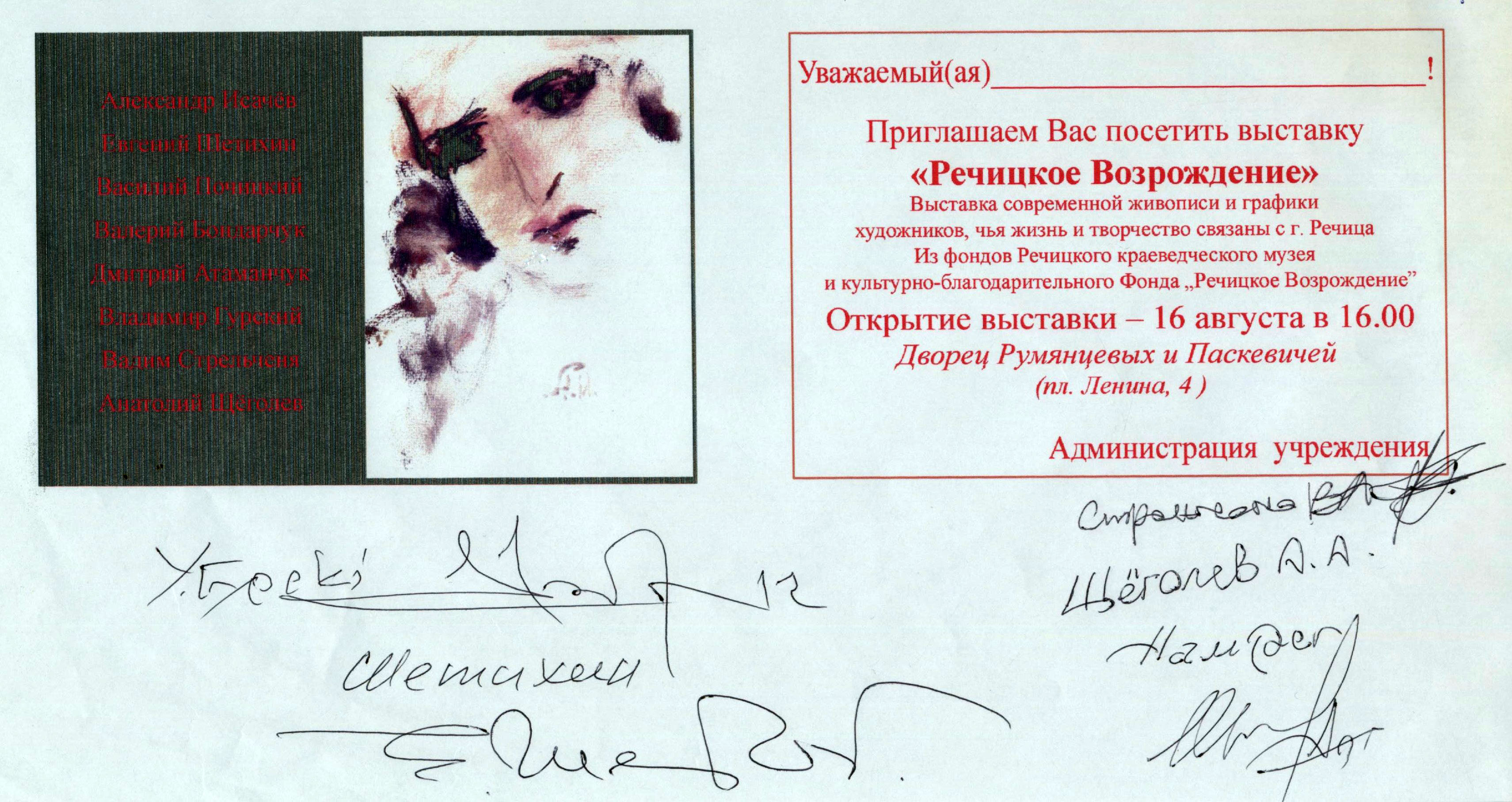 На пригласительном билете помимо Евгения Шитихина оставили свои автографы художники Анатолий Щеголев, Владимир Гурский, Вадим Стрельченя, Дмитрий Атаманчук.