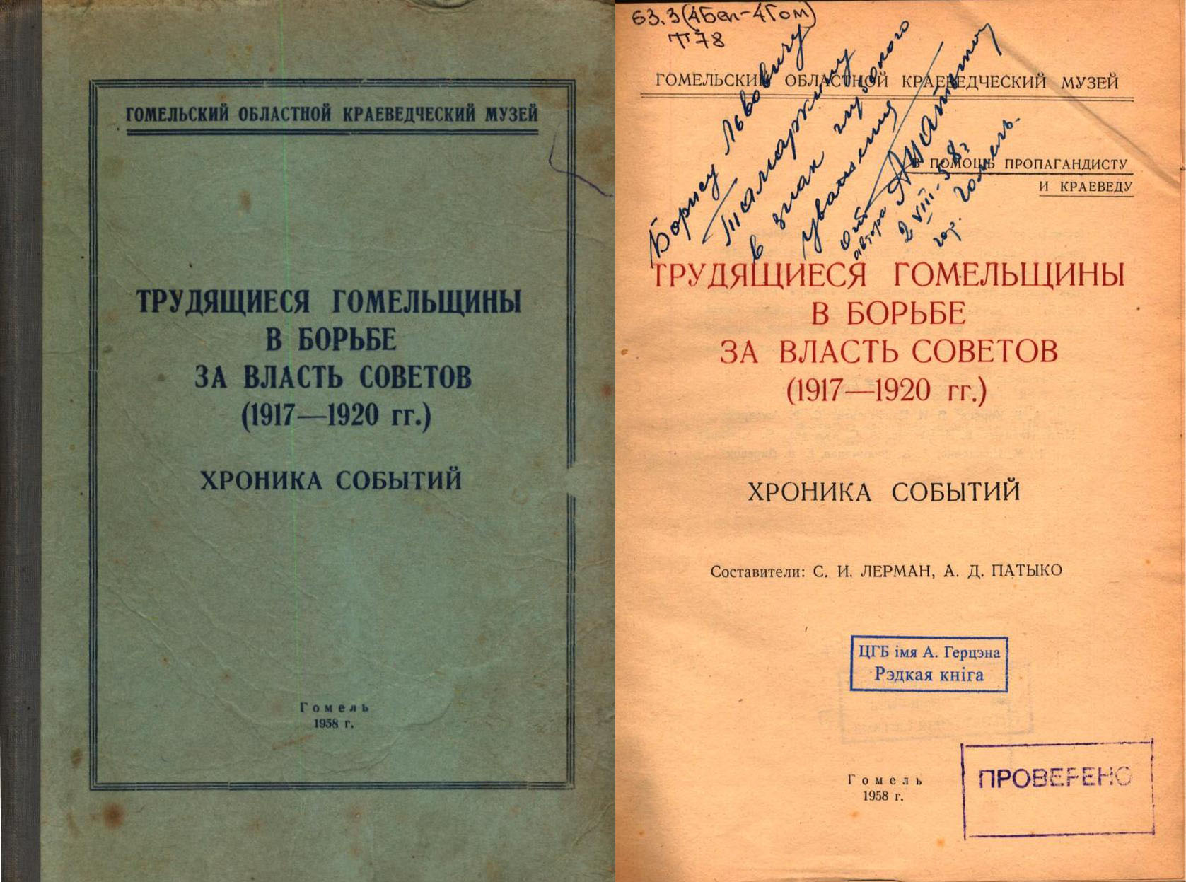 Итогом этой работы был выпуск музеем ряда печатных изданий. В 1955 г. был опубликован Сборник документов о революционных событиях 1905-1907 гг. (214с.) и брошюра «Революционное движение в Гомельской области в 1905-1907 гг. (31 е.). В 1956 г. — «Белорусские пословицы и поговорки». В 1958 г. — сборник «Хроника событий в 1917—1920 гг. » и книга «Трудящиеся Гомеля в борьбе за власть советов (1917-1920гг.) Хроника событий». Составителями последней выступили С.И. Лерман и А.Д. Патыко. В фонды центральной городской библиотеки попал экземпляр данного издания с дарственной надписью А.Д. Патыко.